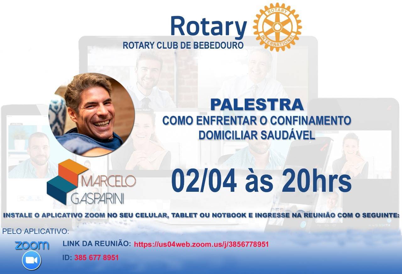 E diante disso, trouxemos para nossa primeira reunião virtual com os companheiros do Rotay Club de Bebedouro, uma palestra virtual com o tema "Como enfrentar o confinamento domiciliar saudável", ministada por Marcelo Gasparini.